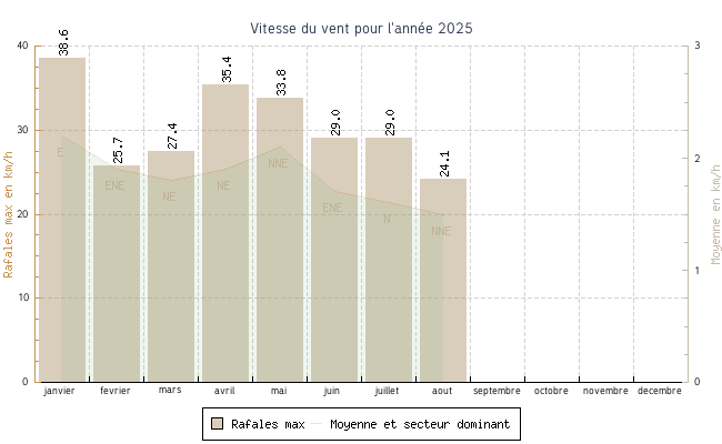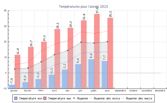 | juillet | 8.8 °C | 13.4 °C | 37.8 °C | 25.4 °C | 19.2 °C | 1.6 km/h | 29.0 km/h | N |